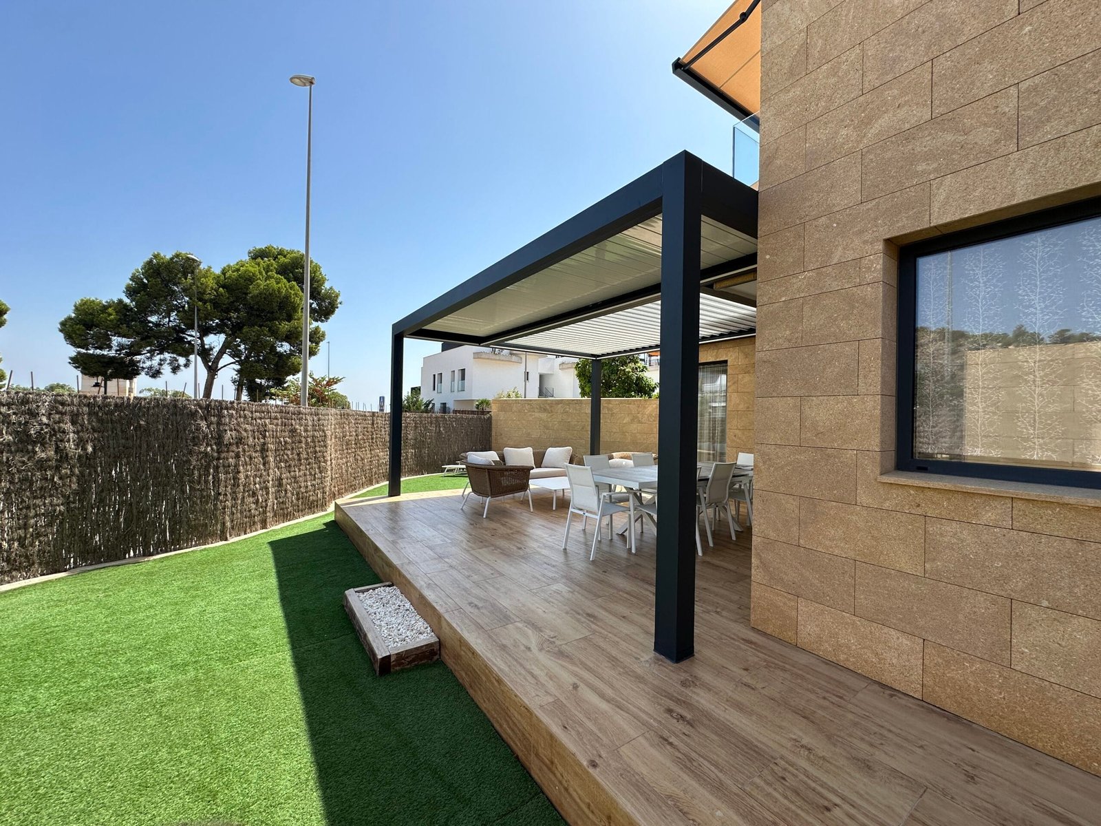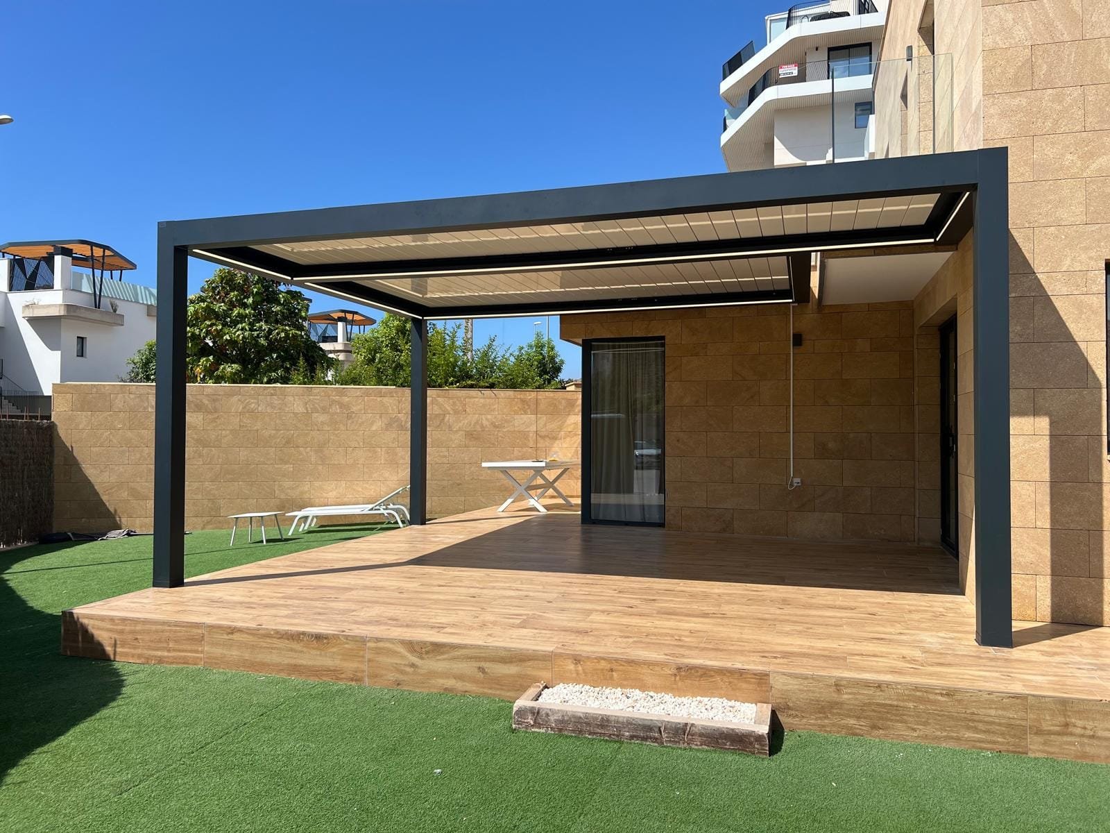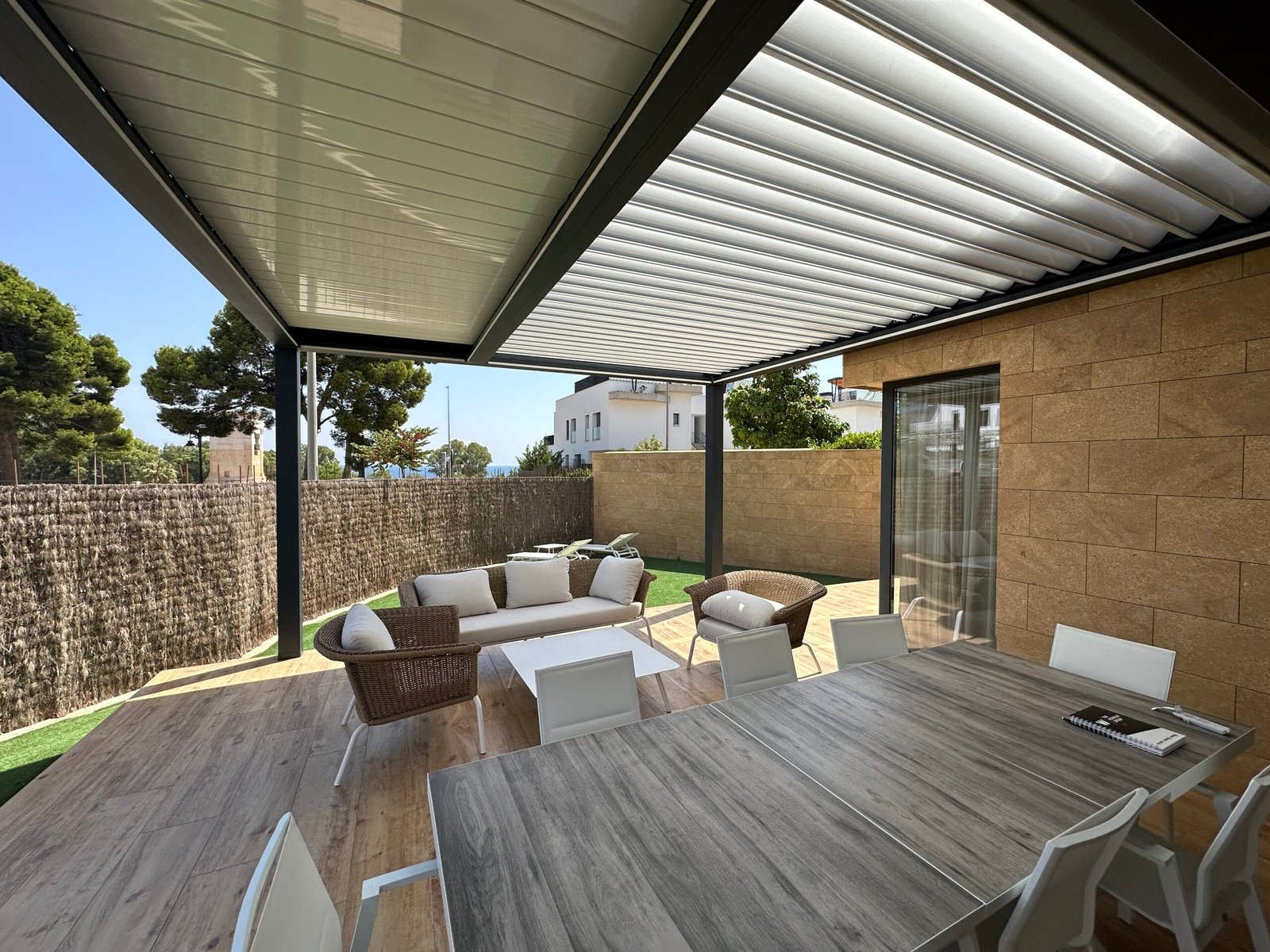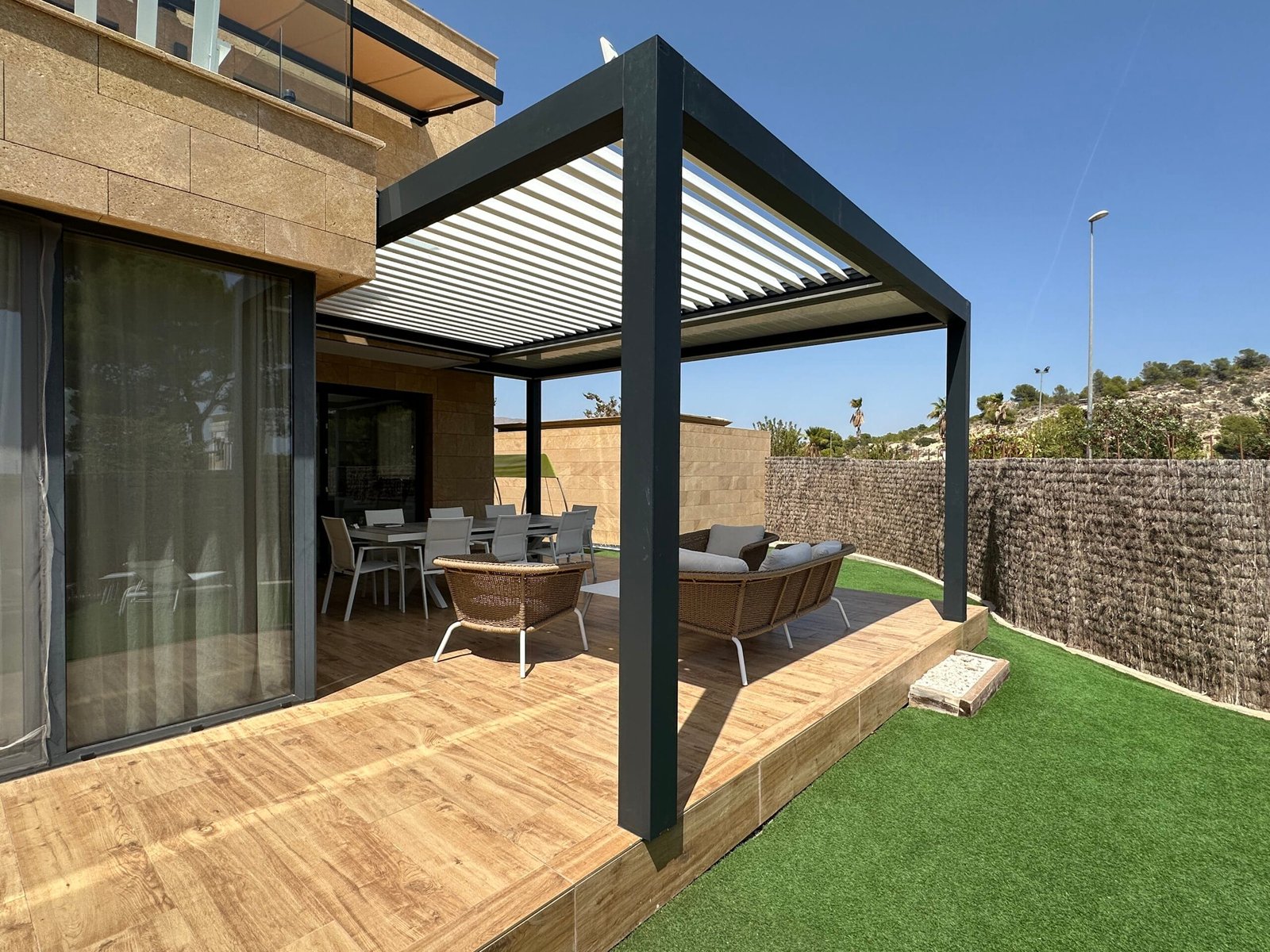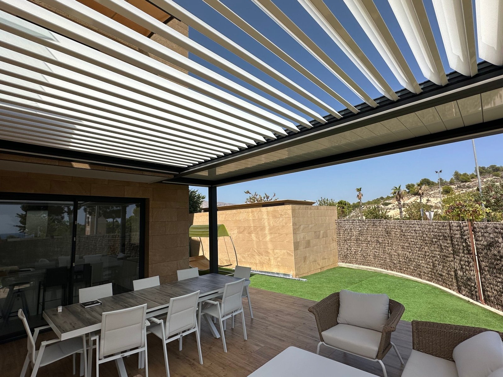 La pérgola bioclimática instalada combina estructura de aluminio lacado y lamas orientables motorizadas, lo que permite regular la entrada de luz y ventilación según las necesidades. Además, su diseño minimalista se integra de forma armoniosa con la estética de la vivienda, aportando un toque moderno y sofisticado.