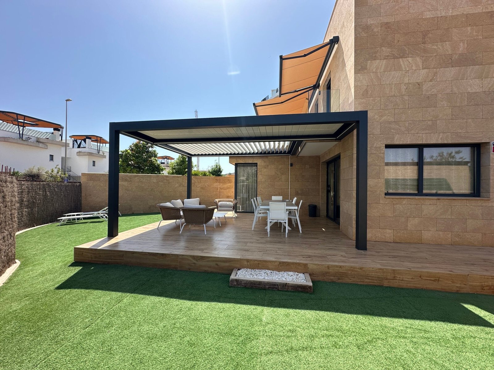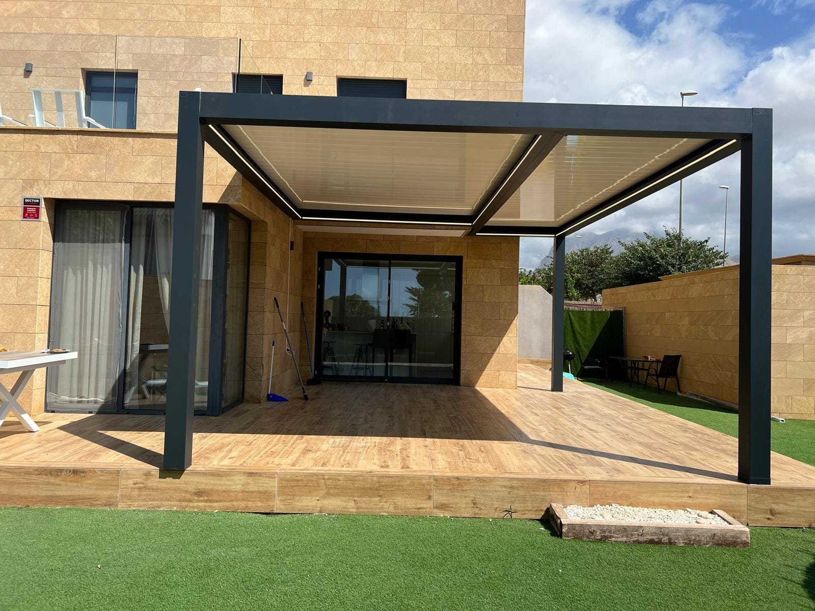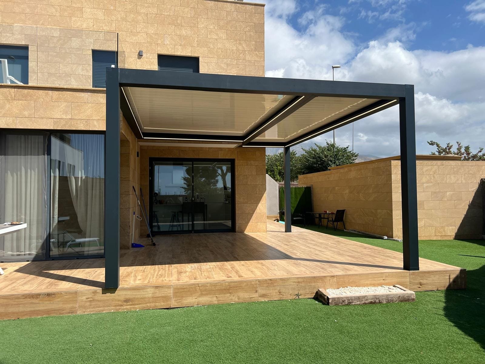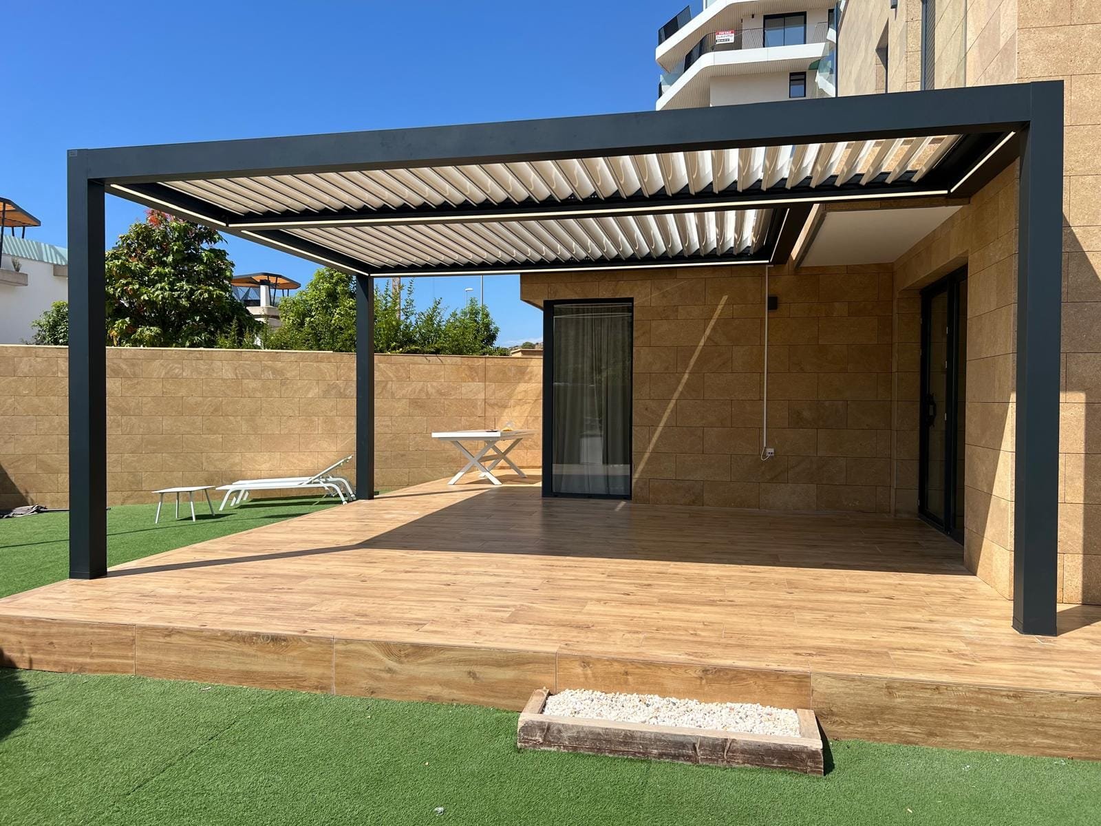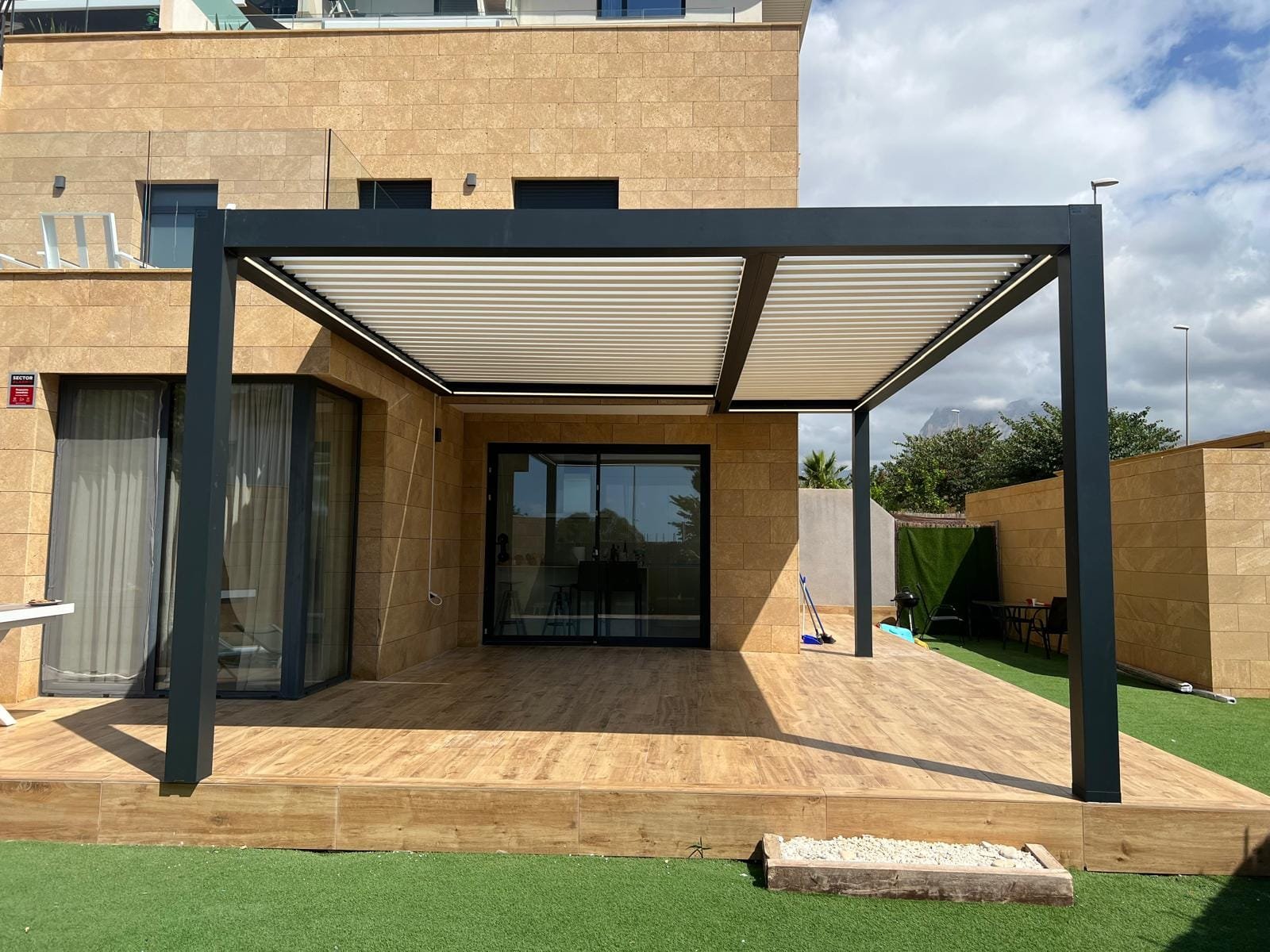 La pérgola bioclimática instalada combina estructura de aluminio lacado y lamas orientables motorizadas, lo que permite regular la entrada de luz y ventilación según las necesidades. Además, su diseño minimalista se integra de forma armoniosa con la estética de la vivienda, aportando un toque moderno y sofisticado.